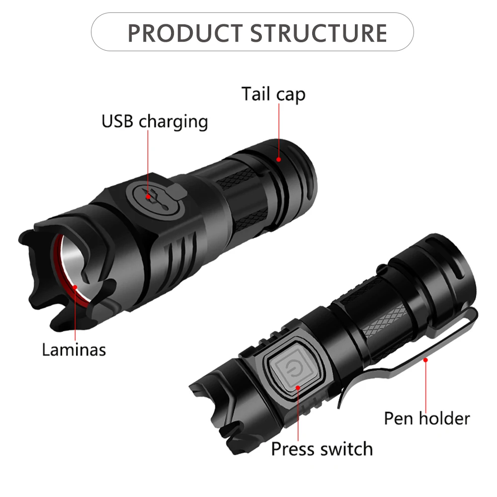 Product Name: Mini Torche Tactique à Chargement USB, T40, LED, Pour La Chasse, Le Camping, Le Travail, Lampe De Poche LED